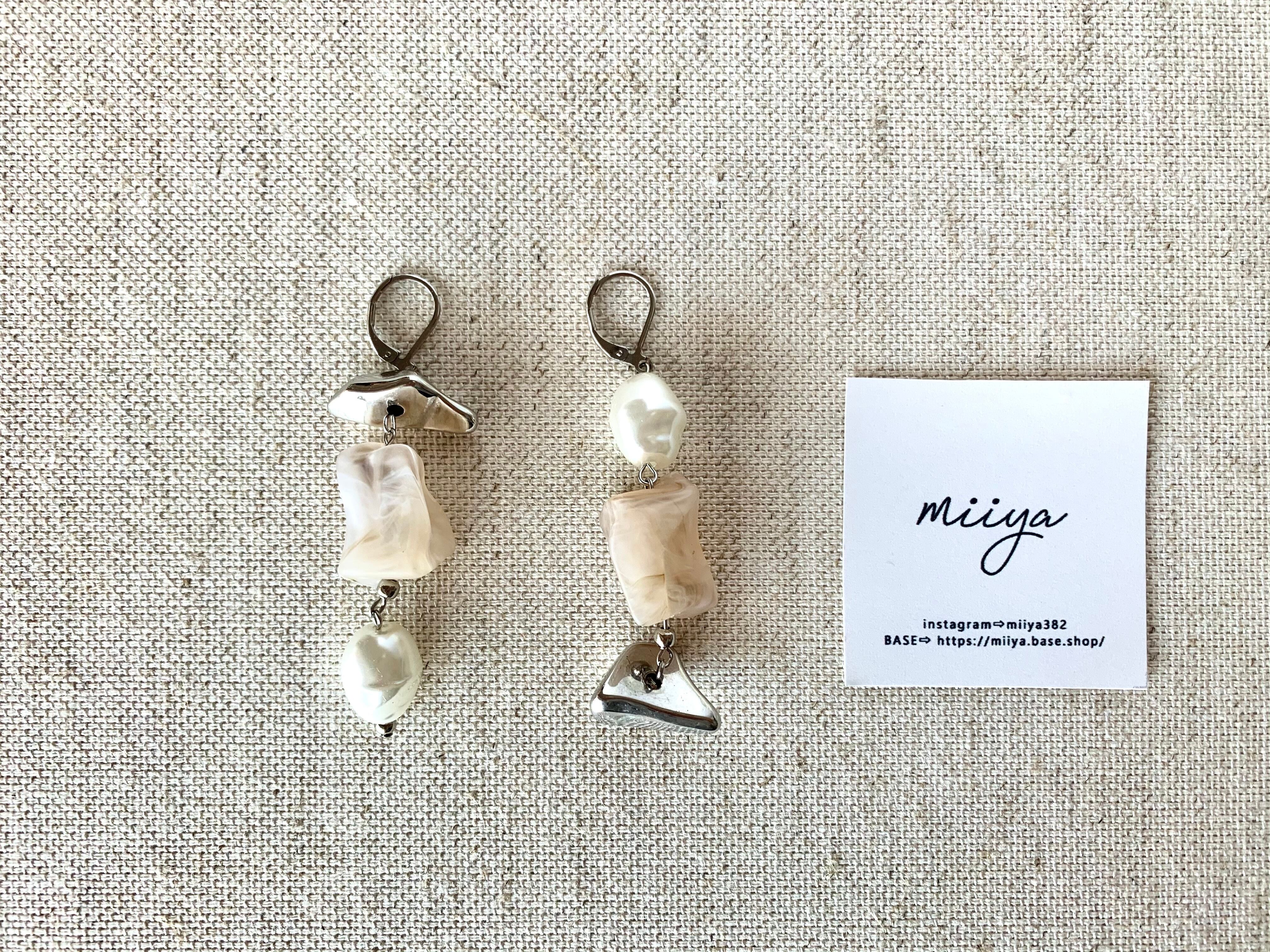 マットベージュマーブルアイスキューブ✖︎オーバルパール✖︎シルバーピアス