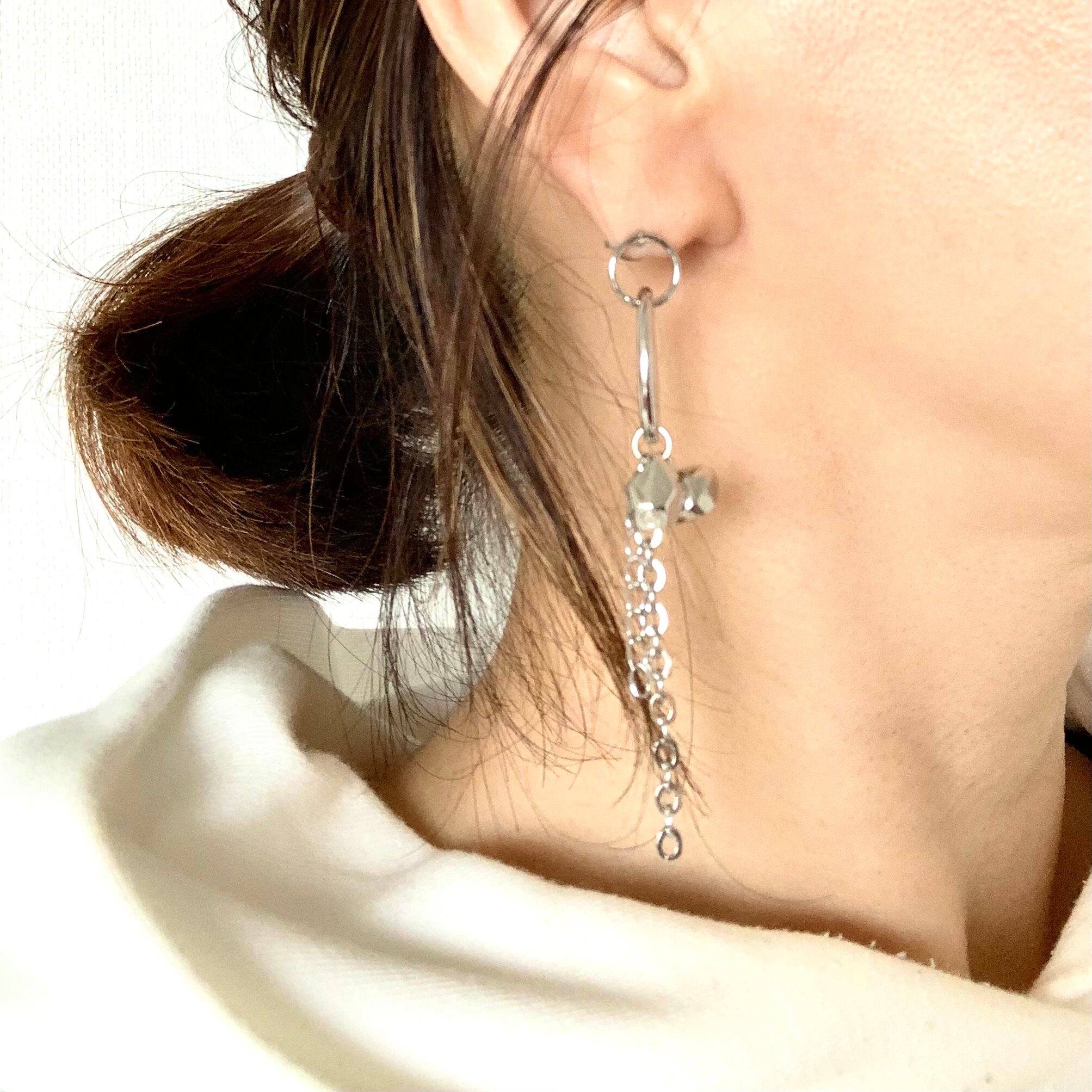シルバーフープ✖︎種類の違うシルバーチェーン✖︎形の違うシルバービーズ✖︎クリアアイスキューブの組み合わせです.