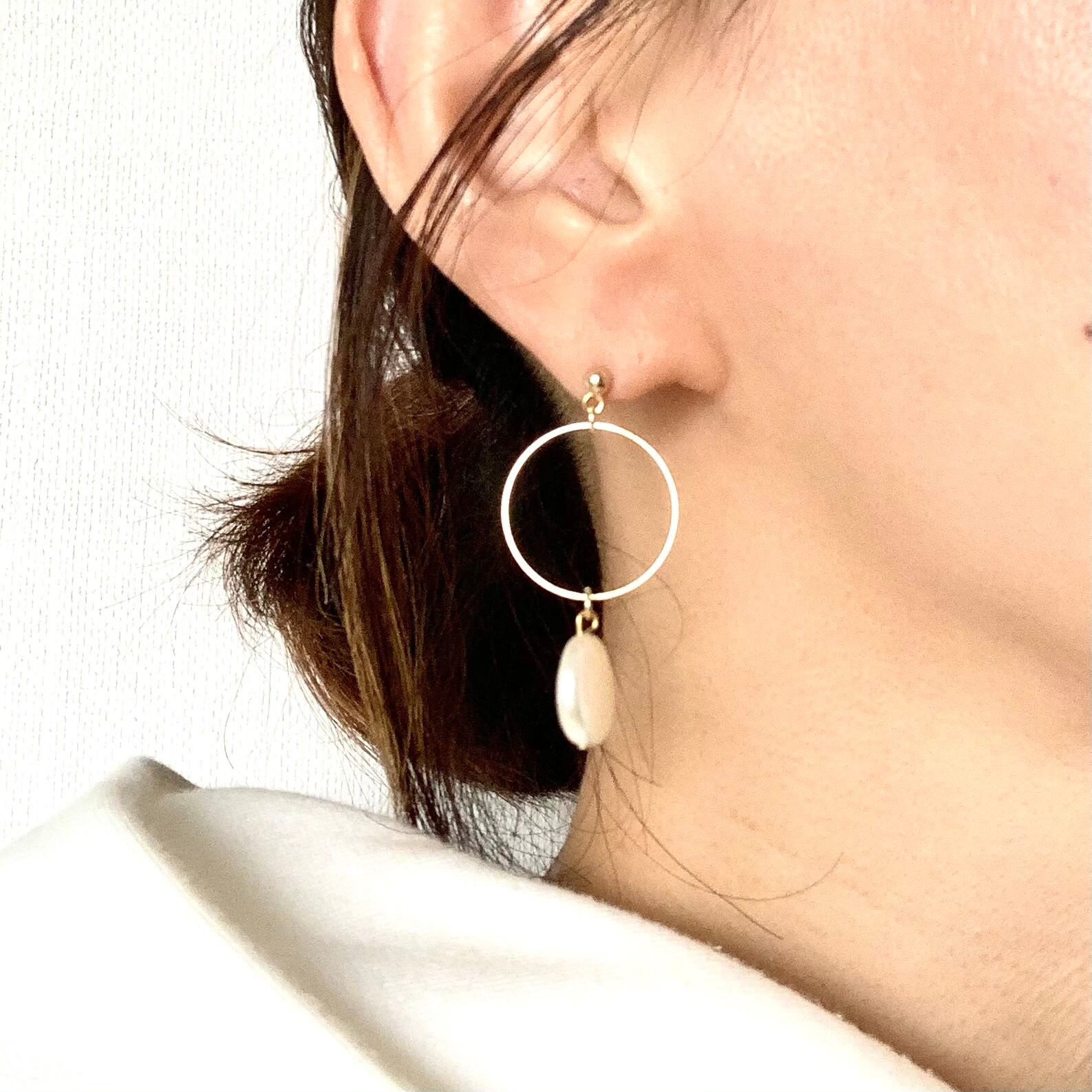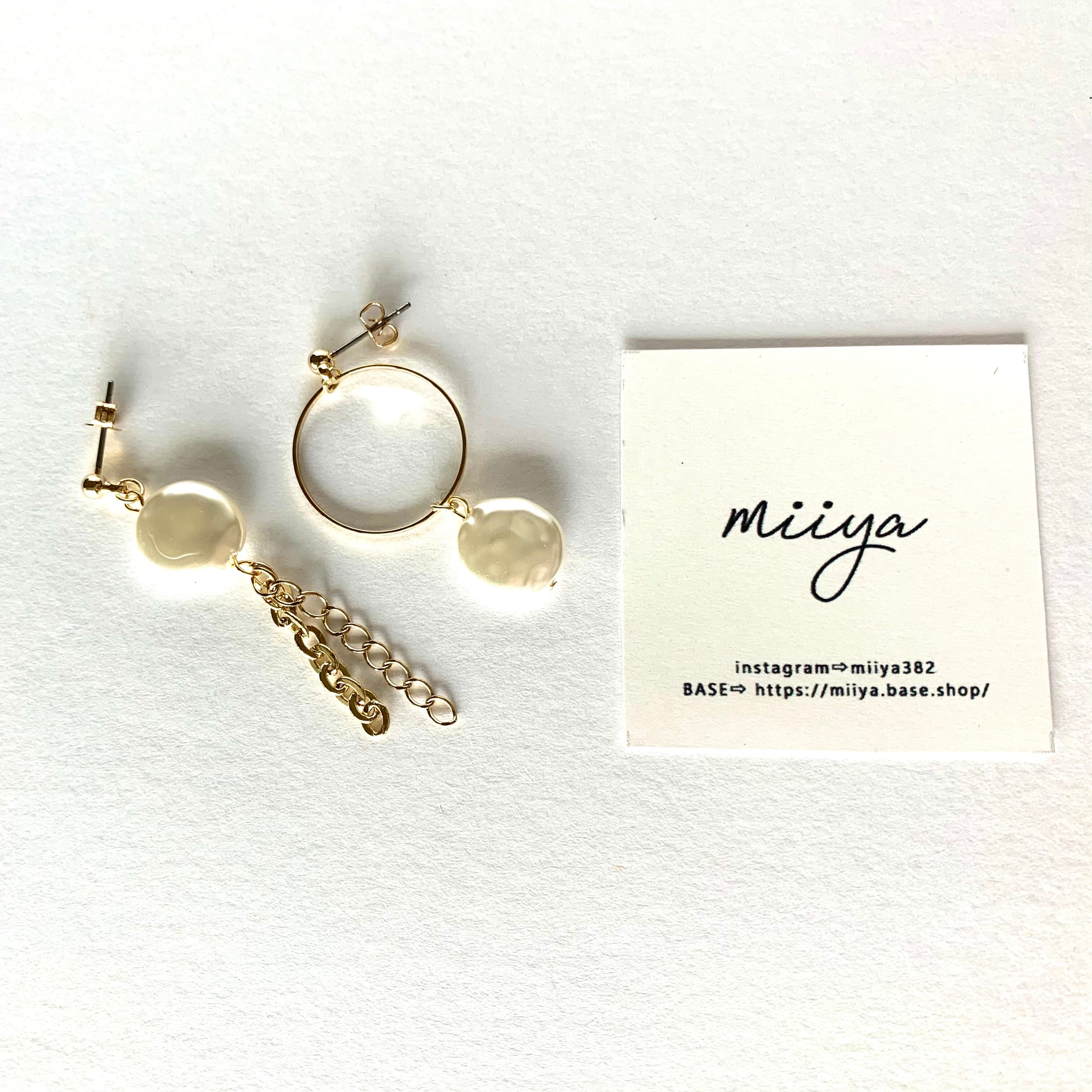 コインアクリルパールをゴールドチェーンとゴールドフープで、アシンメトリーに仕上げました.