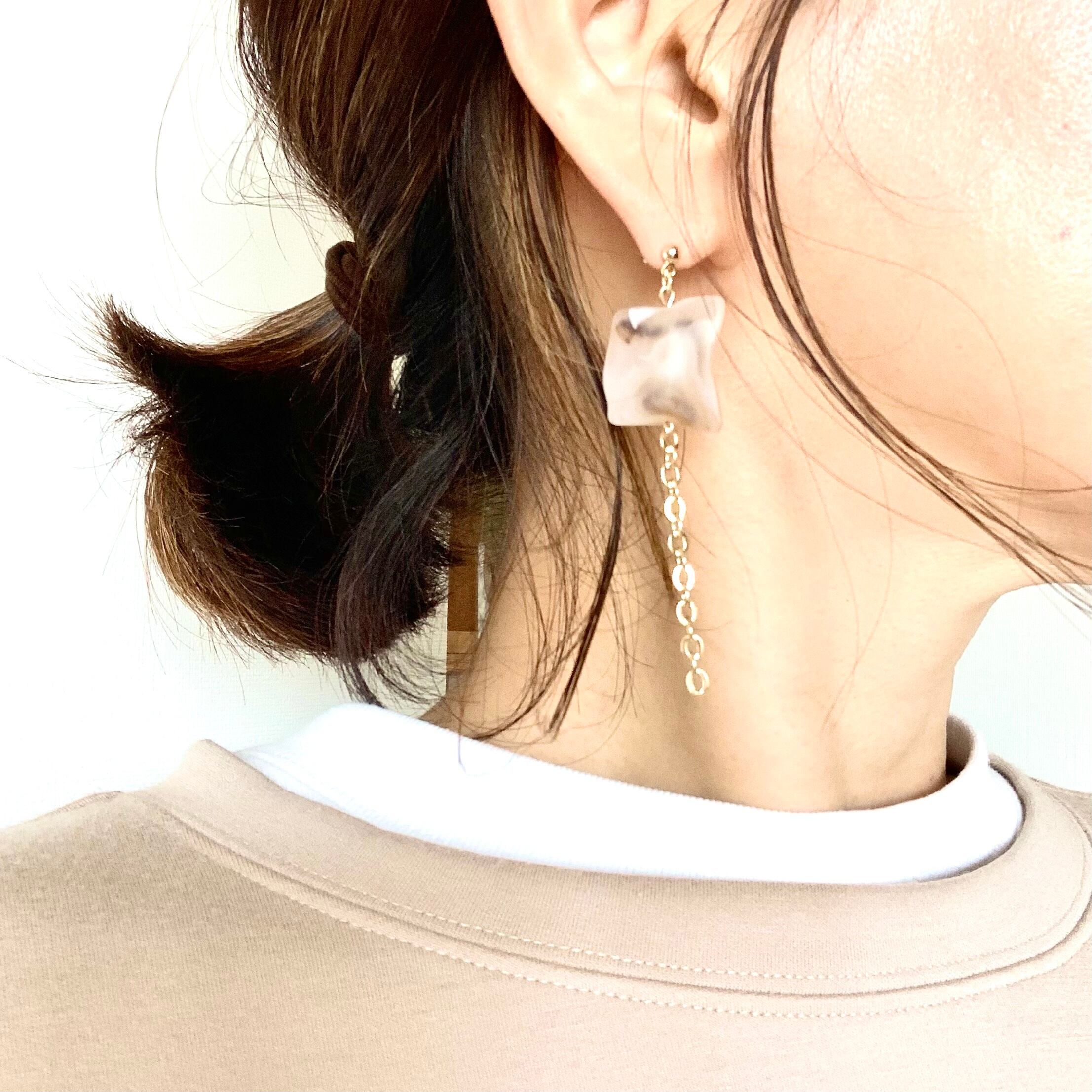 マーブルマットベージュアイスキューブとゴールドチェーンとゴールドフープでアシンメトリーに仕上げました.