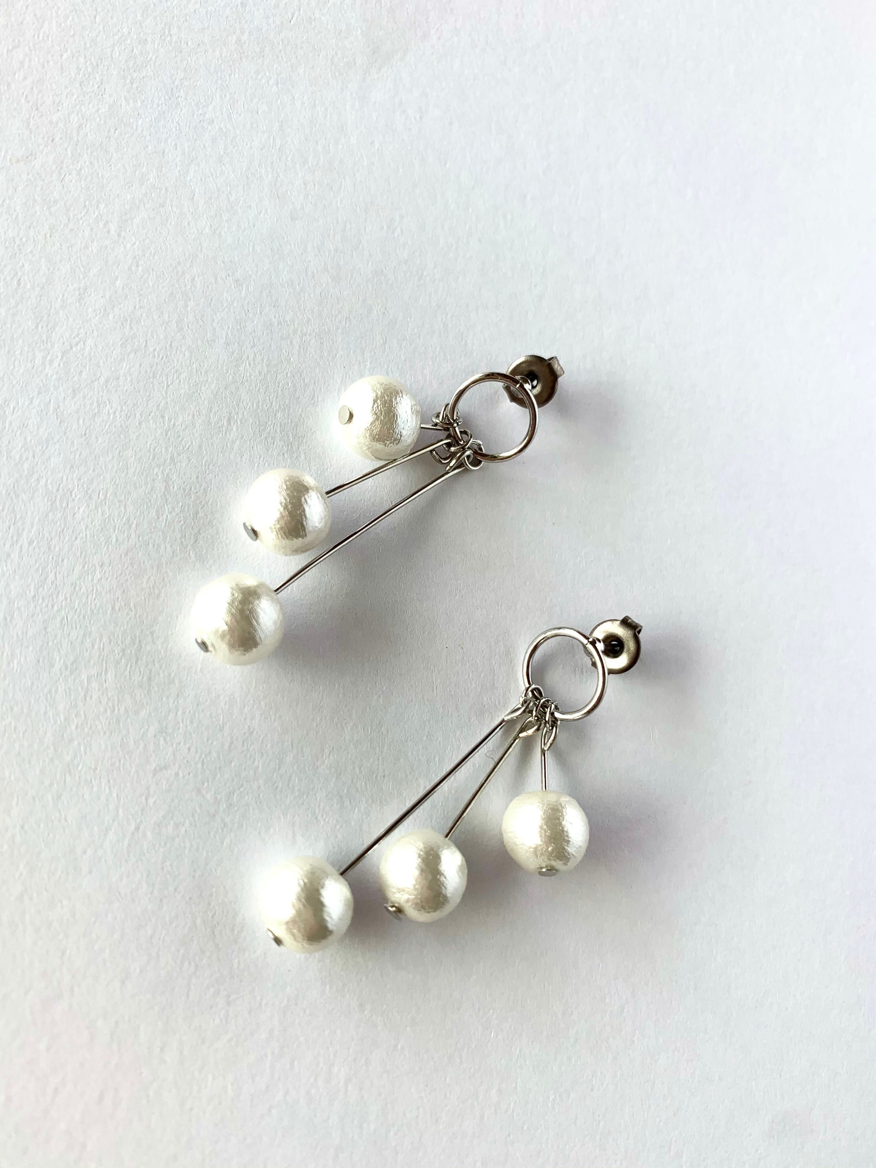 8mmのコットンパールを3つ長さを変えて、フープピアスに繋げました。