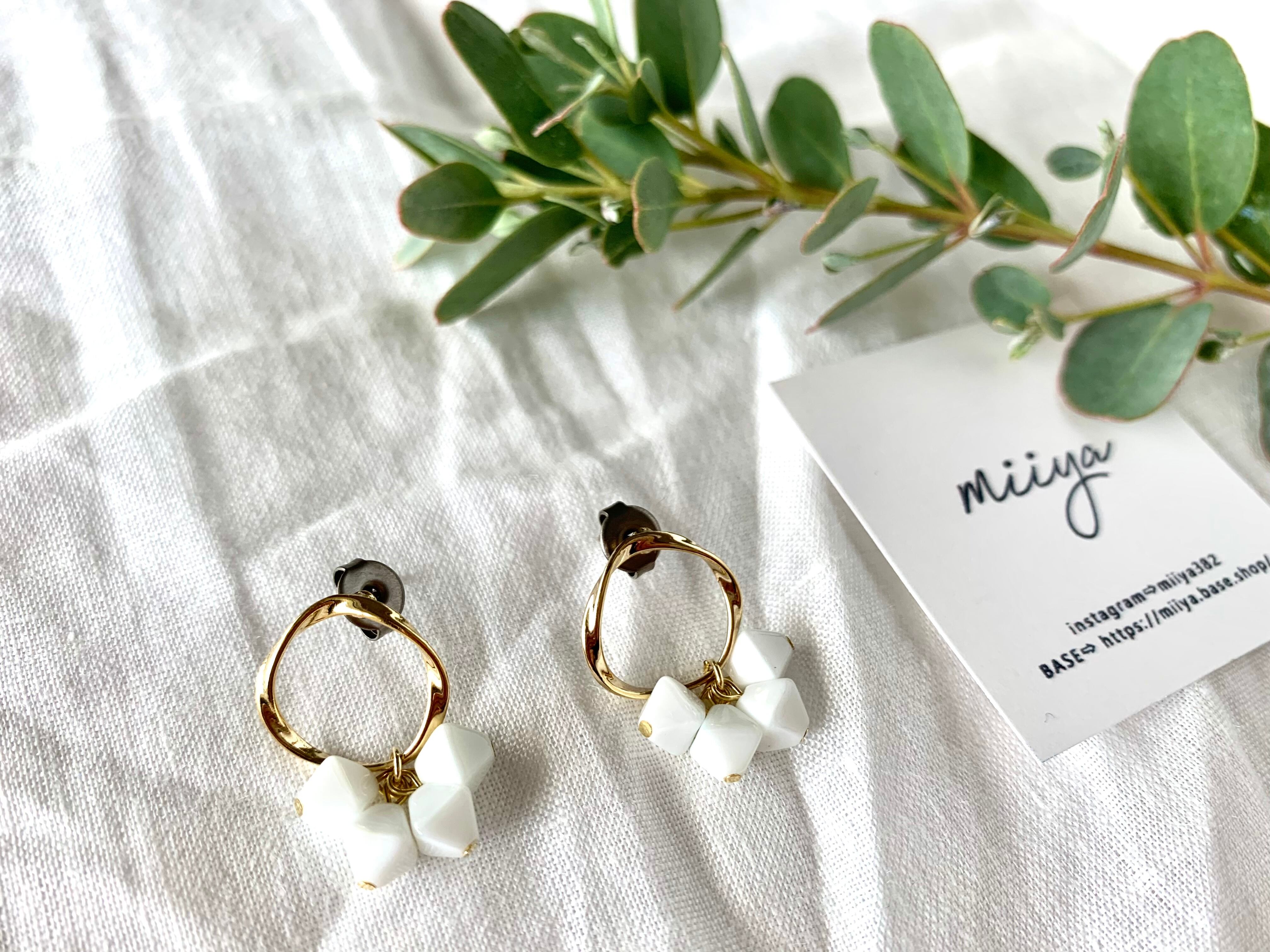 4つの正八面体のチェコガラスホワイトビーズをゴールドフープに組み合わせました。